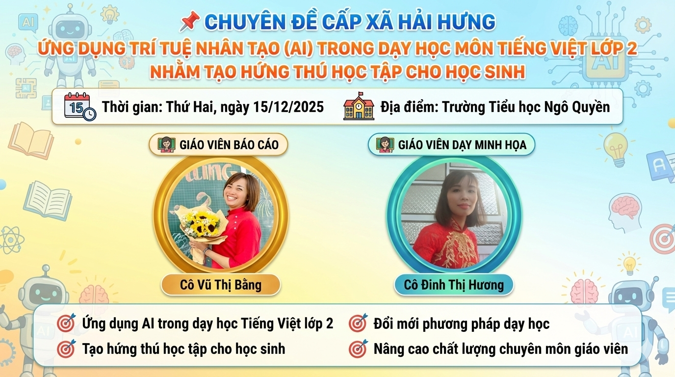 Thực hiện định hướng đổi mới giáo dục và chuyển đổi số trong nhà trường, Trường Tiểu học Ngô Quyền tổ chức chuyên đề cấp xã với nội dung “Ứng dụng trí tuệ nhân tạo (AI) trong dạy học môn Tiếng Việt lớp 2 nhằm tạo hứng thú học tập cho học sinh”, diễn ra vào thứ Hai, ngày 15/12/2025.
