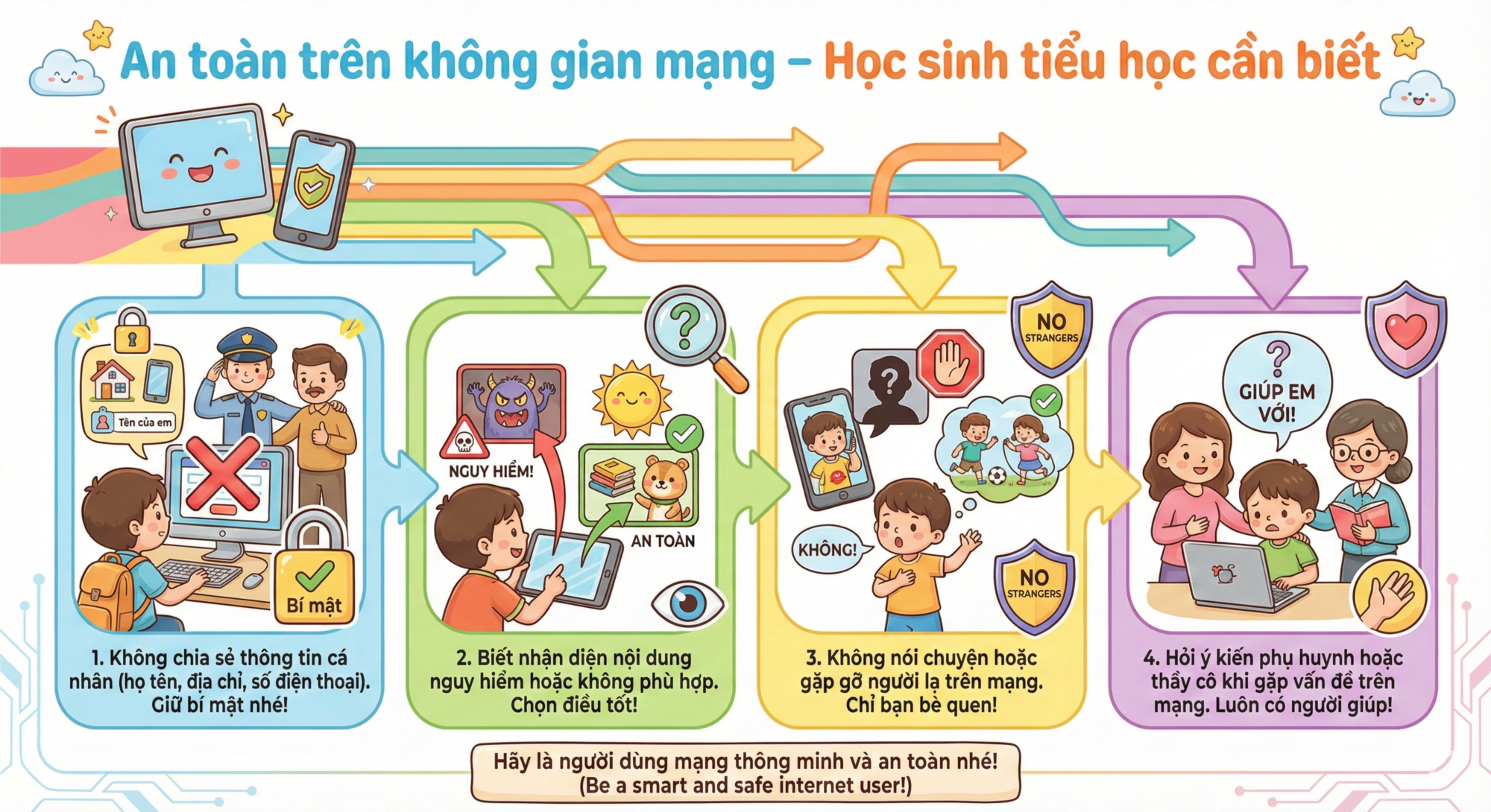Trong thời đại công nghệ phát triển mạnh mẽ, Internet đã trở thành người bạn quen thuộc của mỗi chúng ta, đặc biệt là các bạn học sinh. Internet giúp chúng ta học tập, khám phá thế giới và giải trí mỗi ngày. Tuy nhiên, nếu sử dụng không đúng cách, các bạn nhỏ có thể gặp phải những nguy hiểm không đáng có. Vì vậy, việc trang bị kiến thức an toàn trên không gian mạng là vô cùng quan trọng.