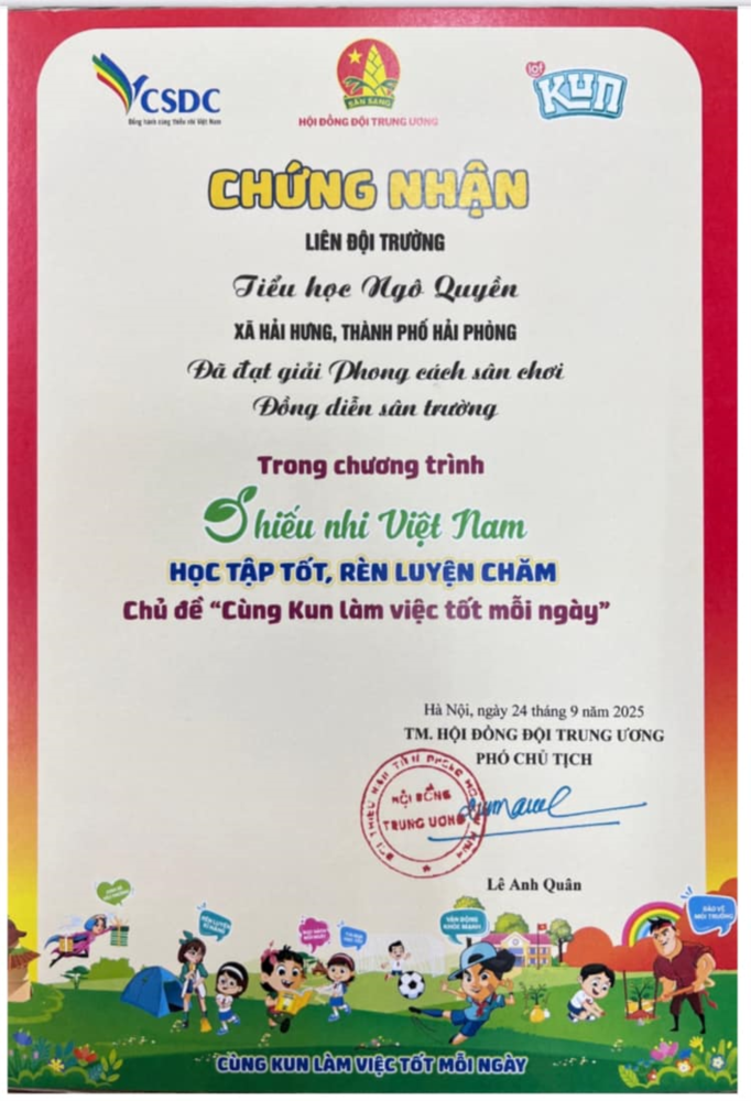 Kết quả, Liên đội Tiểu học Ngô Quyền vinh dự được Hội đồng Đội Trung ương trao giải “Phong cách sân chơi – Đồng diễn sân trường”, ghi nhận sự sáng tạo, tinh thần tập thể và phong cách biểu diễn nổi bật của thầy trò nhà trường.