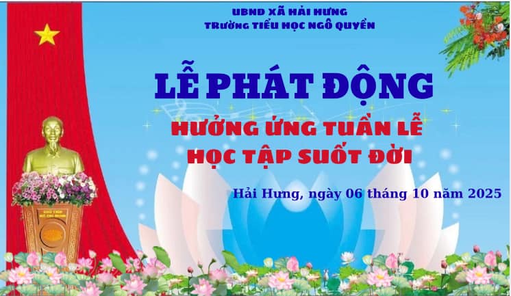 Thực hiện Kế hoạch của Sở Giáo dục và Đào tạo cùng UBND xã Hải Hưng về việc tổ chức Tuần lễ hưởng ứng học tập suốt đời năm 2025, hôm nay, Trường Tiểu học Ngô Quyền long trọng tổ chức lễ phát động với chủ đề: “Phát triển văn hóa đọc trong kỷ nguyên số”. Tuần lễ hưởng ứng học tập suốt đời được tổ chức hằng năm nhằm tôn vinh tinh thần hiếu học, khuyến khích mọi người, mọi nhà, mọi lứa tuổi tích cực học tập – học ở mọi nơi, mọi lúc, bằng nhiều hình thức linh hoạt; hướng đến xây dựng xã hội học tập, nơi mà ai cũng có cơ hội học tập, nâng cao tri thức và hoàn thiện bản thân.